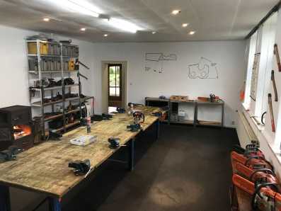 Für die Motorsägenausbildung stehen außerdem in unserem Werkraum zwölf Arbeitsplätze einer Werkbank zur Verfügung, an denen die Teilnehmer Ihre Säge warten können.