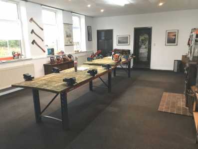 Für die Motorsägenausbildung stehen außerdem in unserem Werkraum zwölf Arbeitsplätze einer Werkbank zur Verfügung, an denen die Teilnehmer Ihre Säge warten können.